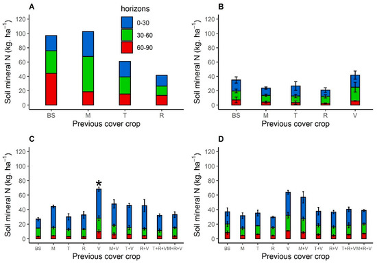 Soil mineral nitrogen (kg ha−1) in the three depth soil horizons (0–30, 30–60, and 60–90 cm) measured at sunflower sowing in 2016 (A), 2017 (B), 2019 (C) and 2020 (D) after bare soil, Brassicaceae, and Fabaceae cover crops sown in sole crops (A–D) or a mixture (C,D) with one Brassicaceae and one Fabaceae, or two Brassicaceae and one Fabaceae. Abbreviation letter refers to BS for bare soil, M for brown mustard, T for turnip rape, R for fodder radish and V for purple vetch. Error bars represent standard errors. There were no blocks in 2016. Soil mineral nitrogen that differed significantly from that of bare soil are indicated by * (p < 0.05).