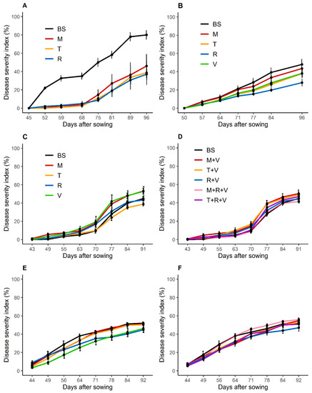 Annual disease severity index (%) progress curves of sunflower verticillium wilt in 2016 (A), 2017 (B), 2019 (C,D) and 2020 (E,F). Sunflower cultivar cv. 1 (A,B) and cv. 2 (C–F) were cultivated after a bare soil, a Brassicaceae or a Fabaceae cover crop in sole crops (A–C,E), or in a mixture with one Brassicaceae and one Fabaceae, or two Brassicaceae and one Fabaceae (D,F). In 2019, the turnip rape did not grow in the mixture with fodder radish and purple vetch. The number of sunflowers recorded was 300 in 2016 (A), 675 in 2017 (B), and 900 in 2019 (C,D) and 2020 (E,F). Abbreviation letter refers to the treatments with BS for bare soil, M for brown mustard, T for turnip rape, R for fodder radish and V for purple vetch. Error bars represent standard errors.