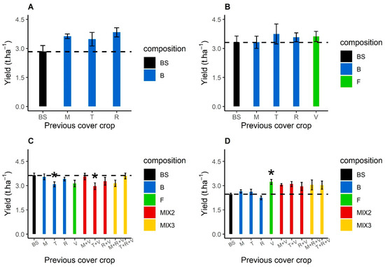 Manual sunflower yields (t ha−1) from the sunflowers monitored for sunflower verticillium wilt severity after bare soil, Brassicaceae or Fabaceae cover crop in 2016 (A), 2017 (B), 2019 (C) and 2020 (D). The yield after a bare soil is in black, blue after Brassicaceae (B) sole crops, green after Fabaceae (F) sole crops, red for a mixture with one Brassicaceae and one Fabaceae (MIX2), and orange for a mixture with two Brassicaceae and one Fabaceae (MIX3). In 2019, the turnip rape did not grow in the mixture with fodder radish and purple vetch. Abbreviation letters refer to the treatment with BS for bare soil, B for Brassicaceae, F for Fabaceae, M for brown mustard, T for turnip rape, R for fodder radish and V for purple vetch. Dashed lines indicate the mean bare soil yield for the year. Error bars represent standard errors. Treatments with yields that differ significantly from that of bare soil are indicated by * (p < 0.05).