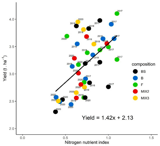 The causal relationship between manual sunflower yield (t ha−1) and nitrogen nutrition index at sunflower flowering cultivated after bare soil (BS), Brassicaceae (B) sole crops, Fabaceae (F) sole crops, a mixture with one Brassicaceae and one Fabaceae (MIX2), and a mixture with two Brassicaceae and one Fabaceae (MIX3) in 2016, 2017, 2019 and 2020. Each point represents the mean values of the yield and the NNI of the composition of each year and each block. In 2019, the turnip rape did not grow in the mixture with fodder radish and purple vetch.