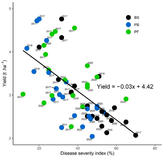 Causal relationship between manual sunflower yield (t ha−1) and disease severity index (%) at sunflower maturity, for sunflowers cultivated after bare soil (BS), Brassicaceae (B) sole crops pooled per year, and Fabaceae (F) sole crops in 2016, 2017 and 2020. Each point represents the values (per blocks and plots) of the yield and the DSI of the cover crop composition per year. Data in 2019 and a mixture of two or three species in 2020 were removed from this regression because no significant regulation of SVW was observed.