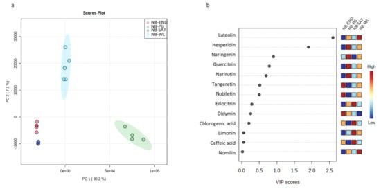After performing a PLS-DA, the top three scores of the Variables Importance in the Projection (VIP) are nobiletin for the differentiation of END-PG, tangeretin for END-PG, and didymin for PG-WL (Figure 2b).