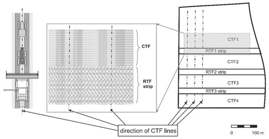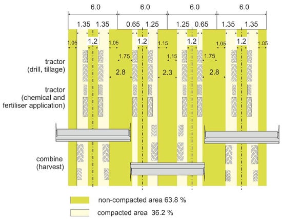 The experimental field was converted from the traditional RTF system into CTF in 2009 (intensive tillage with ploughing was converted to the minimum-conversation tillage system too). An “OutTrac” CTF system with 6m module [] was implemented—Layout of machinery traffic is provided in Figure 2. The OutTrac CTF system uses two track gauges on the same centerline. One gauge matches the common standard on tractors and implements used, and the other matches the combine harvester used.