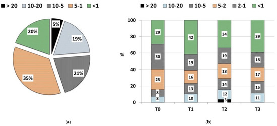 Particle size (mm) distribution: (a) final compost (% weight); (b) growing media: T0 (control—100% peat substrate); T1 (25% compost, 30% sphagnum peat, 15% fen peat, 20% pine bark, 10% wood fiber); T2 (30% compost, 20% sphagnum peat, 30% fen peat, 10% pine bark, 10% wood fiber); T3 (30% compost, 0% sphagnum peat, 30% fen peat, 30% pine bark, 10% woody fiber) (% weight).
