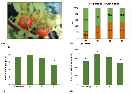 Tomato growers are looking for methods that accelerate fruit production and increase fruit yield [65,67]. Tomatoes sold as potted plants are the most attractive when the berries begin to ripen. For this reason, our study assessed the percentage of ripe berries and the number and weight of fruits per plant at this developmental stage.