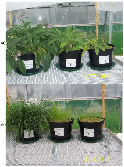 Example of growth response of two plant species namely, Comfrey (Symphytum × uplandicum; (a)) and Italian ryegrass (Lolium multiflorum; (b)) to different fertilisation treatments including (from right to left in the photo) control (no fertiliser applied), broiler litter and pig slurry all applied at rates of 30 kg P ha−1 and 250 kg N ha−1. The photo was taken on 2 July 2019 after a ~3 month-long growing period under controlled greenhouse conditions.