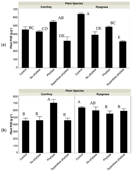 Effects of two different organic amendments (a) pig slurry and (b) broiler litter from different animal diets on plant phosphorus use efficiency (PUE) of two different plant species comfrey (Symphytum × uplandicum) and Italian ryegrass (Lolium multiflorum). Animal diets include: control = only inorganic fertiliser applied once (i.e., one dose of triple super P initially applied to support seedling growth), no-phytase, phytase and superdose phytase. Different letters indicate significant differences among treatments (Tukey HSD test).