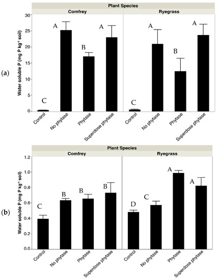 Effects of two different organic amendments (a) pig slurry and (b) broiler litter from different animal diets on soil available P (i.e., WSP) of two different plant species comfrey (Symphytum × uplandicum) and Italian ryegrass (Lolium multiflorum). Animal diets include: control = only inorganic fertiliser applied once (i.e., one dose of triple super P initially applied to support seedling growth), no-phytase, phytase and superdose phytase. Different letters indicate significant differences among treatments (Tukey HSD test).