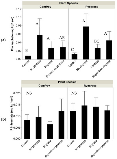 We found that, under pig slurry applications, soil P availability (i.e., WSP) significantly decreased under the ‘phytase’ treatment when compared to ‘no-phytase’ and ‘superdose phytase’ (p = 0.02; Figure 3a). However, broiler litter applications did not have any significant effect on soil P availability under comfrey plants, but increased soil P availability associated with ‘phytase’ and ‘superdose phytase’ under ryegrass plants (Figure 3b).