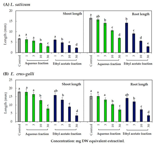 Growth inhibitory effect of the aqueous and ethyl acetate fractions separated from the S. garrettiana leaf extracts against the growth of (A) L. sativum seedlings and (B) E. crus-galli seedlings. Values are the mean (±S.D.) of three replicates (n = 30); different letters on each bar indicate a statistically significant difference between treatments (Tukey’s HSD, at the 0.05 probability level).