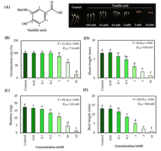 Growth inhibitory effects on Lepidium sativum exposed to vanillic acid isolated from the S. garrettiana leaf extracts. (A) L. sativum seedlings after 48 h of treatment, (B) seed germination, (C) dry biomass, (D) shoot length, and (E) root length. Values are the mean (±S.D.) of three replicates (n = 30); different letters on each bar indicate a statistically significant difference between treatments (Tukey’s HSD, at the 0.05 probability level).
