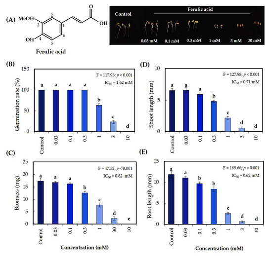 Growth inhibitory effects on Lepidium sativum exposed to ferulic acid isolated from the S. garrettiana leaf extracts. (A) L. sativum seedlings after 48 h of treatment, (B) seed germination, (C) dry biomass, (D) shoot length, and (E) root length. Values are the mean (±S.D.) of three replicates (n = 30); different letters on each bar indicate a statistically significant difference between treatments (Tukey’s HSD, at the 0.05 probability level).