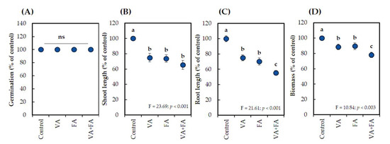 Growth inhibitory effects of a mixture of vanillic acid (VA) and ferulic acid (FA) at a concentration of 0.3 mM on (A) seed germination, (B) shoot length, (C) root length, and (D) dry biomass of L. sativum. Values are the mean (±S.D.) of three replicates (n = 30); different letters on each bar indicate a statistically significant difference between treatments (Tukey’s HSD, at the 0.05 probability level).