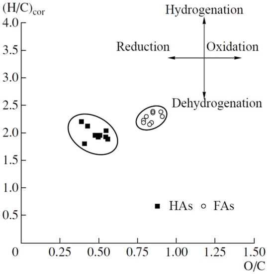 The Van Krevelen graphical statistical analysis also demonstrates higher oxidation and lower carbon content of FAs compared to HAs (Figure 1), which indicates a significant substitution of aromatic rings and the development of side aliphatic chains [,].