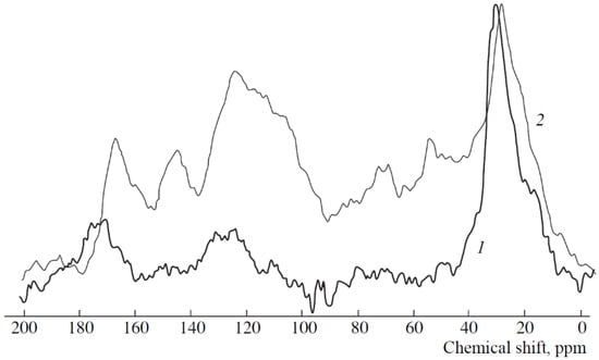 At present, the use of modern physicochemical research methods has made a more detailed study of the HS molecule structure possible, without a need to resort to molecule destruction. Methods such as IR, NMR, and EPR spectroscopy can provide extensive information not only about the qualitative set of the most important atomic groups and types of bonds, but also about the specific arrangement of individual functional groups and molecular fragments []. These physicochemical methods allow studying not merely diluted preparations or dry matter, but also compounds in an intermediate state (such as colloids or gels). A huge advantage of these methods lies in the potential to examine both HS and organogenic (peat or histic-like) horizons or soils in general, without exposing the studied object to any treatment, except for grinding. It permits tackling the problem of the correspondence between HS preparations and native substances, which are part of the unchanged soil composition [,,,,]. Advances in the technology of the NMR method have made it possible to use it to study SOM in general and HS in particular. The use of superconducting magnets and Fourier transforms has not only made it possible to calculate the integral signal intensity, but also to separate signals when they are superimposed or exposed to a high noise level []. These methodological improvements allow is greater accuracy in quantitative estimates (with lower acquisition time). To obtain spectra of solid matters, the solid-phase method CPMAS (Cross-Polarization Magic-Angle Spinning)—a technique with sample rotation at a magic angle—has been developed [,,]. The advantage of acquiring spectra in a solid-state is the possibility of introducing much more carbon in the sample probe (better signal-to-noise ratio at the same acquisition time). Furthermore, insoluble macromolecular substances (e.g., HS) can be studied, and it is not necessary to find a suitable solvent for the sample, if any.