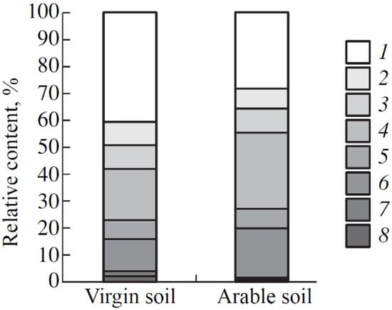To study the effect of agricultural development on the structural and functional composition of HS by 13C NMR spectroscopy (CPMAS technique), preparations of HAs from the Oara horizon of the arable Eutric Albic Retisol (Loamic) were studied (Figure 2). The influence of soil development on the relative content of functional groups and molecular fragments of HAs is shown in Figure 3.