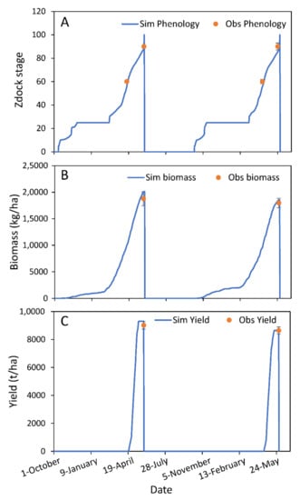 Parameterisation (Table 2) was performed by minimising the sum of squared errors for measured and simulated phenology, biomass and yield following the approach outlined by Harrison et al. []. Field data measured at Yanzhou in 2015 were used for parameterisation while data obtained in 2016 and 2017 were used for validation. We applied the evaluation criteria outlined by Harrison et al. [], where the ideal root-mean square error (RMSE) and mean bias (MB) values are represented by 0.0; MB < 1 and MB > 1 represent model underestimation and overestimation of observed data, respectively. Relative root-mean square error (RRMSE) values of <5% = excellent, 5–10% = very good, 10–30% = good and >30% = poor. The ideal variance ratio (VR) is 1; VR > 1 indicates greater variation in the actual data compared with the simulated data. Calibrated genetic parameters showed in Table 3.