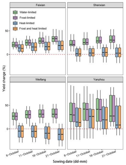 After including the effect of frost and heat stress in the model, averaged water-limited yield decreased by 17% across sites and sowing dates, and the yield reduction was mainly caused by heat stress (i.e., heat-limited yield). Simulated yield loss caused by heat stress was much higher than that caused by frost due to climate warming across sites. The yield increase in water-limited potential yield in the 2050s decreased from 31% to 9% (heat and frost limited yield). This difference was especially pronounced at Weifang and Shenxian, while Feixian and Yanzhou are affected by heat and frost stress to a lesser extent.