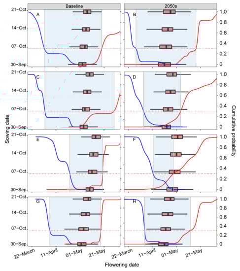 Impact of sowing date on the timing of flowering compared to the occurrence of extreme-temperature events under the periods of 1981–2010 (baseline) and 2031–2060 (2050s) across sites ((A,B) Feixian; (C,D) Shenxian; (E,F) Weifang; (G,H) Yanzhou). The boxplot shows the variation in flowering date (x-axis) for different sowing dates (left y-axis) over 30 years. Probabilities of last frost days (left blue solid line), and first heat days (right red solid line) are calculated as the percentiles of last frost and first heat days for baseline and 2050s. The low-risk period for frost and heat and preferred flowering window is highlighted in grey. The upper horizontal dashed red line indicates the 30% risk of first heat and frost day.
