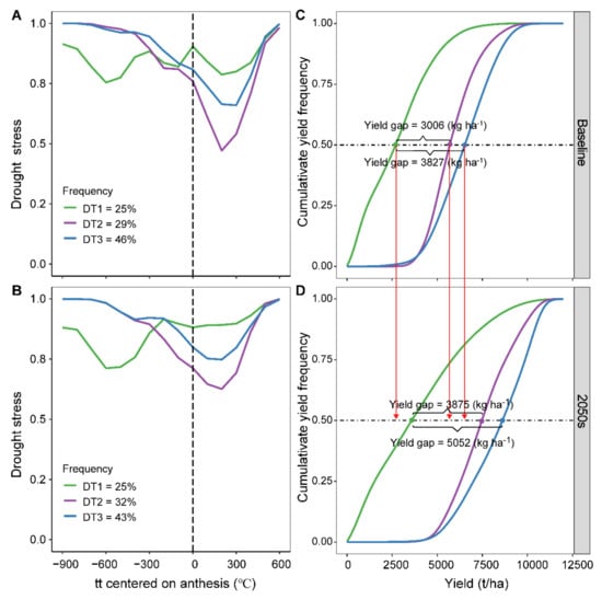 In addition to heat and frost stress, drought stress is another factor limiting yield potential in the NCP. These regions are projected to suffer a high frequency of DT1, which is most detrimental for yield, in the near future, and the extreme drought stress might cause more severe yield penalties (Figure 5). To breed genotypes with improved drought tolerance, it is necessary to characterise the typology and frequency of drought patterns experienced by crops both under historical and future climates [,,]. Our results showed that drought-stress patterns expected under future conditions will be similar to those occurring under present conditions (Figure 5). This result has many important implications for breeding drought-tolerant genotypes. If the major drought-stress patterns expected under future conditions were unlike those experienced currently, then crop breeding for future conditions would be difficult, as seasonal patterns in future climates might not occur under field conditions at frequencies high enough to influence the direction of germplasm development in breeding trials. In such cases, crop adaptation to specific drought-stress seasonal patterns would need to be performed under controlled-stress environments, as suggested by Bänziger et al. []. However, as the typologies of the key drought-stress seasonal patterns occurring under present conditions are likely to be similar to those expected in future climates, selection of elite wheat germplasm for superior yield under present conditions using field trials should be an appropriate method for developing germplasm suitable for the near future. Despite the higher temperatures and increased winter precipitation predicted in the NCP for the 2050s, the impact of drought stress on simulated wheat yield is predicted to be smaller in most cases (32–43%; See DT2 and DT3 in Figure 5B,D). However, the probability of heat stress around flowering that might result in considerable yield losses is predicted to increase significantly (Figure 4). Breeding strategies for the future climate might need to focus on wheat varieties tolerant to high temperatures more than to drought.