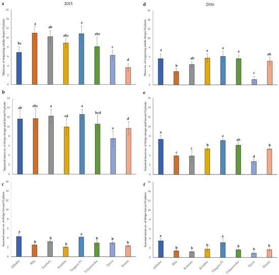 Mean (±SE) Thrips tabaci abundance on onion cultivars: (a,d) during onion plants colonization by the adults, (b,e) throughout the growing season by adults and larvae, and (c,f) by larvae of thrips in 2015 and 2016. Means with the same letters on each bar do not differ significantly (Duncan’s multiple range Test, p < 0.05).