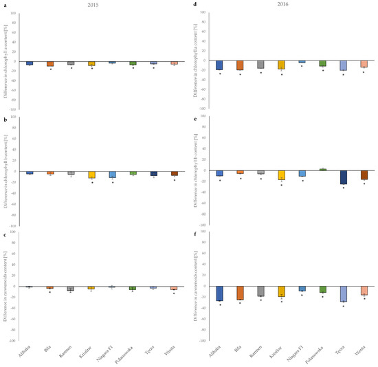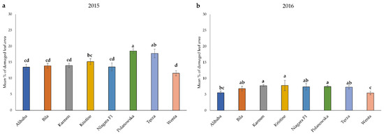 Chlorophyll a and b and total carotenoid contents in undamaged and damaged onion leaves are presented in Tables S6 and S7. In both years, there was a significant effect of the variety (p < 0.05) on contents of chlorophyll a and b, and sum of carotenoids in undamaged and damaged leaves of onion cultivars, and there was no block effect only on concentrations of chlorophyll b and a sum of carotenoids in damaged leaves in 2015 (Tables S6 and S7).