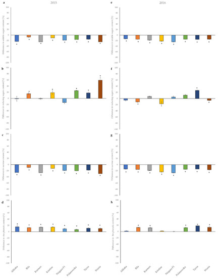 In the leaves of onion plants which were not damaged by the onion thrips, the contents of total soluble sugars and sucrose were significantly higher than in damaged leaves in all onion cultivars, in both 2015 and 2016 (Figure 3a,c,e,g).