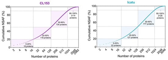 The cumulative percentage of the normalized spectral abundance factor (NSAF) revealed that a relatively low number of proteins contributed to most of the protein biomass (Figure 1). In fact, half of the proteome biomass, as assessed by the NSAF, was explained by 134 and 142 proteins in CL153 and Icatu plants, respectively.