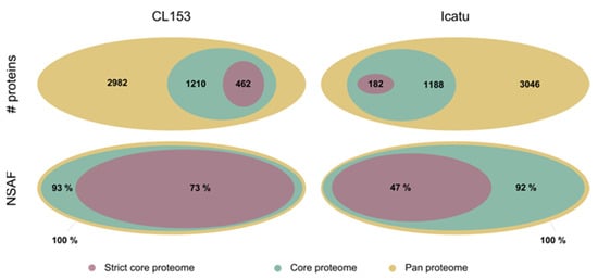 The components of the core proteome—proteins identified in at least one replicate of each experimental condition—were relatively common in CL153 (1210) and Icatu (1188), representing about one-third of the total proteins identified, the so-called pan proteome (Figure 2). The core proteome represented by far the greatest percentage of the total proteome measured by the NSAF values, reaching as much as 92–93% of the protein biomass. Additionally, when considering only proteins from the strict core proteome—proteins identified in all the samples—these represented 73% (CL153) and 47% (Icatu) of the global protein content (Figure 2).