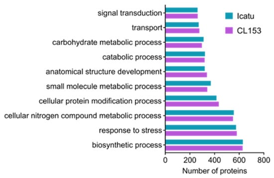 Distribution of the 10 most represented GOslim terms associated with the core proteome of Coffea canephora cv. Conilon Clone 153 and C. arabica cv. Icatu genotypes.