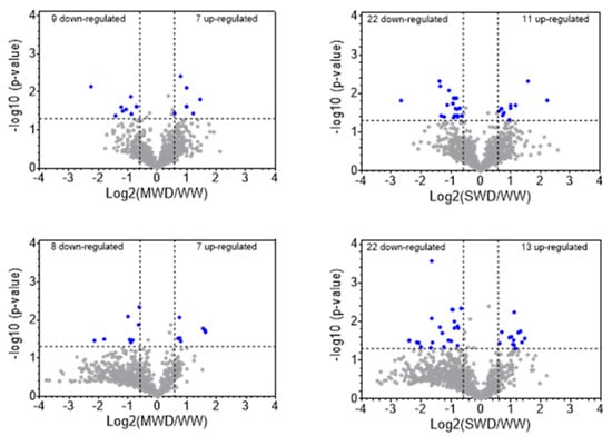 Volcano plots depicting the differentially abundant proteins (DAPs) found between well-watered plants (WW) and either moderate water deficit (MWD) or severe water deficit (SWD) for Coffea canephora cv. Conilon Clone 153 (upper graphs) and C. arabica cv. Icatu (lower graphs) genotypes. Significant DAPs are indicated with blue dots. The x-axis represents the log2 fold change in differences of protein abundance between treatments, while the y-axis represents the p-value (–log10).