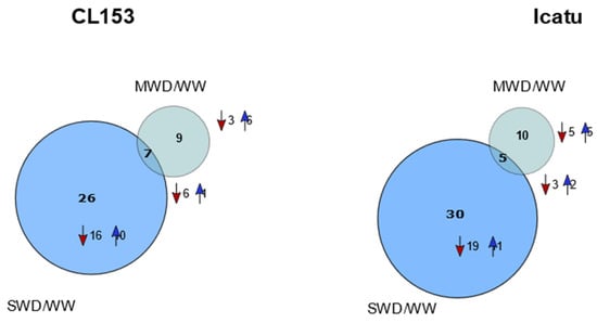 Proportional Venn diagrams showing the patterns of significant differentially abundant proteins (DAPs) found between moderate water deficit (MWD) and well-watered (WW) plants (MWD/WW) or between severe water deficit (SWD) and WW plants (SWD/WW) in Coffea canephora cv. Conilon Clone 153 (CL153) (left) and C. arabica cv. Icatu (right) genotypes. Numbers in bold indicate the total number of DAPs while arrows indicate the number of DAPs, either with decreased (red) or increased abundance (blue) in each comparison.