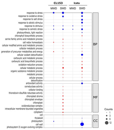 Enriched GO terms found in Coffea canephora cv. Conilon Clone 153 (CL153) and C. arabica cv. Icatu genotypes when comparing well-watered plants (WW) with those exposed to moderate (MWD) or severe (SWD) water deficit. GO terms indicate Biological Processes (BP), Molecular Functions (MF), and Cellular Components (CC). Colors indicate the number of GO-terms that decreased (red) or increased (blue) in abundance upon water deficit imposition.