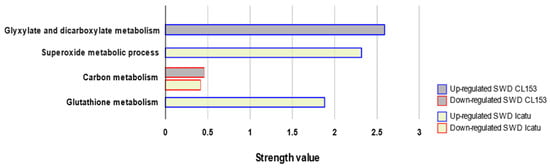 Despite the observed number of GO-terms referred above, due to the reduced number of proteins involved in each one, only four significant KEGG pathways were found enriched upon water deficit exposure, and all of them being restricted to SWD, that is, no significant KEGG pathways were found under MWD (Figure 7). Up-regulated DAPs in CL153 were enriched in the KEGG pathway of glyoxylate and dicarboxylate metabolism, while, in Icatu, two other pathways were found: the superoxide metabolic process and the glutathione metabolism (Figure 7). In contrast, the KEGG pathway of carbon metabolism was linked to down-regulated DAPs in the two genotypes, although at a minor magnitude (Figure 7).