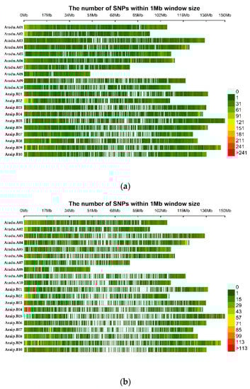 Single nucleotide polymorphisms (SNP) distribution in the 20 chromosomes of the cultivated peanut. The horizontal axis shows the chromosome length (Mb); the shades of red represent SNP density. The vertical axis shows the 20 chromosomes. (a) Polymorphic SNPs (except for scaffold markers); (b) Polymorphic SNPs (except for scaffold markers) after filtering by GAPIT coding.