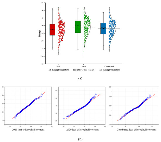 (a) Peanut leaf chlorophyll content histogram using the normal distribution test. The minimum and maximum values of leaf chlorophyll content in the 2019 season were 2453 and 5110, respectively, and those in the 2020 season were 2025 and 5100, respectively. The minimum and maximum values for the combined leaf chlorophyll content across both seasons were 2425 and 4863, respectively; (b) The normal distribution test showed that the scatter points of the quantile–quantile (QQ plot) graph were clustered around the fixed line for the 2019, 2020, and the combined leaf chlorophyll content (p = 0.05).