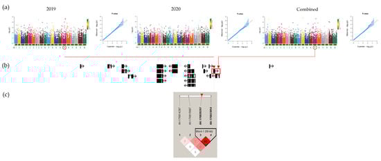 (a) A Manhattan plot of a genome-wide association analysis using GAPIT and a Q-Q (quantile–quantile) plot; (b) Genes located at the association regions based on the Arachis hypogaea Tifrunner 1.0 reference genome; the Arahy.SDG4EV gene is marked in a red square pattern showing that it was found in both the 2019 and the combined season GWAS results; (c) A linkage disequilibrium (LD) plot generated using HaploView software showing r2 values for selected AX-176820297 SNP on chromosome Araip.B05 within diamonds. Significant combined p values are highlighted in red.