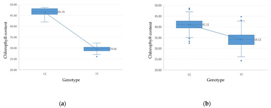 To evaluate the genotype–phenotype association of the SNP AX-176820297, we selected the 10 peanut accessions with the highest chlorophyll contents and the 10 with the lowest chlorophyll contents based on the chlorophyll phenotype data across the seasons. The results indicated that the accessions with the highest chlorophyll contents showed a CC genotype, whereas the accessions with the lowest chlorophyll contents had a TT genotype, presenting a statistically significant difference with a p-value of 5.07 × 10−17 (Figure 4a and Supplementary Table S5). Then, a total of 392 peanut accessions were used to determine the correlation between genotypes (CC or TT) and phenotypes, which was found to be statistically significant (p < 0.001) (Figure 4b and Supplementary Table S6).