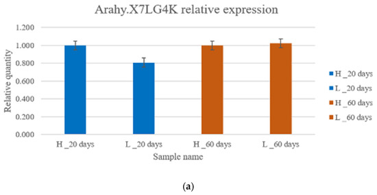 After a series of comparisons of candidate genes with each gene annotation, referring to the published orthologous genes in the Arabidopsis genome, we selected two candidate genes, Arahy.X7LG4K and Arahy.SDG4EV, potentially associated with leaf chlorophyll content from 76 candidate genes (Supplementary Table S8) within a 200 kb region upstream or downstream of the peak SNPs. No statistical difference was detected in the expression levels of Arahy.X7LG4K between H (GWP174) and L (GWP 411) (Figure 5a). However, the expression level of Arahy.SDG4EV was statistically significant (p < 0.05) at two different time points (20 and 60 days) (Figure 5b). H (GWP174) presented a more than three-fold lower expression than L (GWP 411) (Supplementary Table S9).