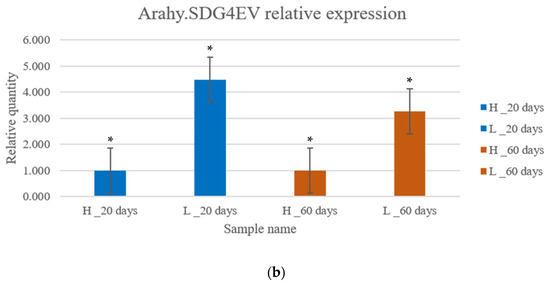 Gene Expression Analysis by qRT-PCR. Peanut accession H (GWP174) exhibiting high leaf-chlorophyll content and peanut accession L (GWP 411) showing low leaf-chlorophyll content at two different time points, 20 and 60 days. (a) Gene relative expression levels of Arahy.X7LG4K in H (GWP174) and L (GWP 411); (b) Gene relative expression levels of Arahy.SDG4EV in H (GWP174) and L (GWP 411). * Represents a significant difference in the two expression levels (p < 0.05).