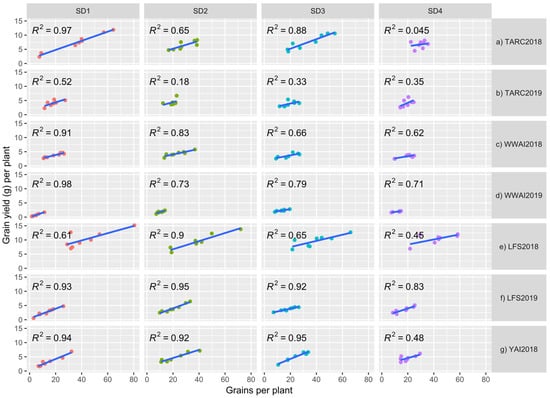 The various yield components when regressed towards final grain yield differed on their contribution on a per plant basis across experiments and sowing dates. Grain number accounted for most of the variation (84.9%), followed by pod number (78.3%), with grains per pod contributing the least (29.2%). The relationship between grain yield per plant and grain number was explored and showed positive correlations in all the experiments (Figure 1a–g). At TARC, there was a high correlation between grain number and grain yield per plant in 2018 except for SD4 (R2 = 0.045), with SD1 having R2 = 0.97 value. However, in 2019 at TARC the correlations were low with a high of R2 = 0.52 in SD1. At WWAI in both years the R2 values were large, ranging from 0.62 for SD4 in 2018 to 0.98 for SD1 in 2019. At LFS and YAI the correlations were high except for SD4 in 2018, with R2 = 0.45 and 0.48, respectively.