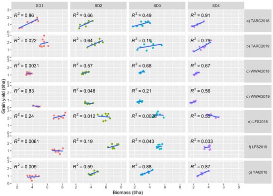 The correlation between total biomass and grain yield was highest in the late-sown experiments (SD3 and/or SD4) in all the environments except for LFS (Figure 2a–g). Correlations were mostly positive except in WWAI2018 (SD1), WWAI2019 (SD1 and SD2) LFS2018 (SD2 and SD3) and LFS2018 (SD1) that showed negative correlation between biomass and grain yield. Correlations were generally low for LFS, which had very high biomass of up to 8 t/ha for some varieties, ranging from no correlation for SD3 in 2018 to moderately high correlation (R2 = 0.55) for SD4 in 2018.