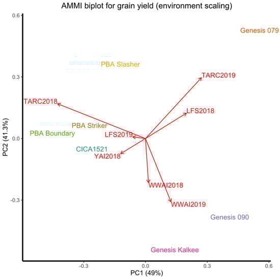An additive main effects and multiplicative interactions (AMMI) biplot provides a visual representation of genotype performance and environmental correlations for grain yield (Figure 3). Both PCA1 and PCA2 are significant at the 0.001 level, with the PC1 axis explaining 49% and the PC2 axis explaining 41.3% of the G × E interaction sum of squares. Together, these two principal components explained 90.3% of the G × E interaction. The genotypes did not cluster together in the AMMI biplot, but some environments did, such as WWAI2018 and WWAI2019. There was no correlation between TARC2018 with either LFS2018 or YAI2018, and a negative correlation between TARC2018 and the rest of the environments. There was a positive correlation between WWAI2018/WWAI2019 with both YAI2018 and LFS2019, and a negative one with LFS2018 and TARC2019. LFS2018 was positively corelated with TARC2019, uncorrelated with LFS2019 and TARC2018, and negatively correlated with the rest of the environments. Varieties PBA Slasher and PBA Striker were closer to the origin and GenesisTM 090 and PBA Boundary were further from the origin. Environments in southern NSW (WWAI2018/2019, LFS2018/2019 and YAI2018) were closer to the origin than the central western NSW environments (TARC2018/2019).