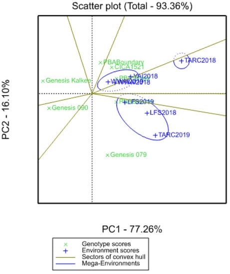 The WWAI environments clustered together and influenced genotypes in a similar way across the two years, as similar conditions and management practices were experienced and/or applied. A higher positive correlation between the WWAI environments with YAI2018 might partly be because of similar dry conditions, while correlation with both YAI2018 and LFS2019 might also be due to similar climatic conditions because of geographic proximity. However, lack of correlation with LFS2018 demonstrates that other confounding factors such as irrigation, beyond climatic conditions and geographic proximity, also had an effect. Differences between experiments are due to the diverse range of climates including altitudes, watering regimes and soil types in the experimental locations. Year-on-year variation was observed at TARC, where TARC2018 did not cluster with any environment, including TARC2019, and formed its own mega environment (ME1). No variety performing well in ME1. Dry conditions at TARC in 2018 created challenges with establishment and overall plant density and this could have made this environment unique and unrelated to TARC2019, which was in the same mega environment as the LFS environments. TARC2019, like LFS2018 and LFS2019, received a significant amount of irrigation (175 and 87 mm pre- and post-sowing, respectively) and this limited moisture stress might have driven the similarities. This was possibly the case with the clustering of the WWAI and YAI experiments as these received minimal irrigation during the season. At the other locations, the year-on-year variation was minimal as the LFS and WWAI experiments fell into the same mega environments across the two years. However, this study demonstrates the importance and need to take year-on-year variation into consideration when interpreting multi-year field studies.