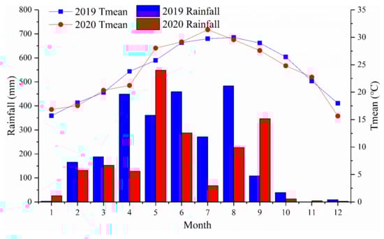 Temperature and rainfall trend during 2019 and 2020 at SCAU experimental farm.