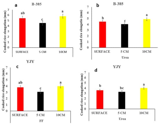 The effects of fertilizer application on cooked rice elongation in the grains of B-385 and YJY: (a) B-385 cooked rice elongation under different applications of FF; (b) B-385 cooked rice elongation under different applications of Urea; (c) YJY cooked rice elongation under different applications of FF; (d) YJY cooked rice elongation under different applications of Urea. (a, b, c, ab, cb) on each barre indicate significant differences among different treatments p < 0.05 within a variety.