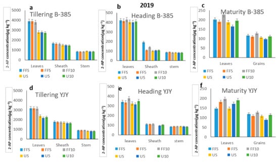 According to the interactions, the two cultivars were significantly affected by the application of fertilizer, in terms of 2AP content, at different stages of growth (tillering, heading and maturity) and in different parts of the plant (leaves, sheaths and grains), except for the stem (Table 6). With regard to the interactions caused by variations in the application of the X fertilizer, B-385 and YJY were significantly affected by the placement of fertilizers, in terms of the 2AP content, during the two years. The 2AP content, cultivars and rice growth stages were significantly affected by differences in the application of fertilizer (surface, 5 cm and 10 cm) and their interactions are detailed in Table 6.