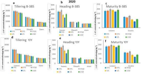 AP contents (μg kg−1) of different cultivars under fertilizer application in 2019: (a) AP content (μg kg−1) of B-385 rice cultivar under fertilizer application at the tillering stage; (b) AP content (μg kg−1) of B-385 rice cultivar under fertilizer application at the heading stage; (c) AP content (μg kg−1) of B-385 rice cultivar under fertilizer application at maturity; (d) AP content (μg kg−1) of YJY rice cultivar under fertilizer application at the tillering stage; (e) AP content (μg kg−1) of YJY rice cultivar under fertilizer application at the heading stage; (f) AP content (μg kg−1) of YJY rice cultivar under fertilizer application at maturity.