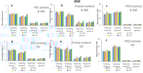 Over two year-long periods of cultivation, during the tillering stage of all the treatments, the leaves showed no significant differences in terms of the enzymes (P5C, P5CS, and Proline) involved in the biosynthesis of 2AP (Figure 5 and Figure 6). On the contrary, over the same period, at both the heading and maturity stages, and between all the treatments for both the B-385 and YJY rice cultivars, the leaves showed significant differences in terms of the activities of the three enzymes (P5C, P5CS, and Proline) involved in the biosynthesis of 2AP (Figure 5 and Figure 6). Furthermore, for both B-385 and YJY, the application of fertilizer at 10 cm was higher compared to those other treatments (5 cm and surface placement). Similarly, the P5C activity, P5CS activity and Proline content were significantly affected by the application of fertilizer in grains: FF10 > FF5 > FFS for Fragrant Fertilizer, and U10 > U5 > US for Urea (Figure 5 and Figure 6).