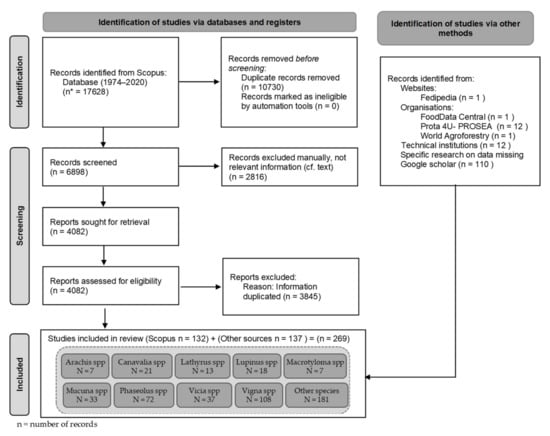 PRISMA 2020 flow diagram systematic review on pulses []. Details on the species included as well as on the number of papers retrieved are provided in Table 1.